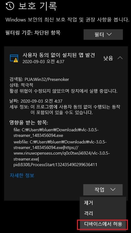 문제 되는 앱을 경고 해제하고 싶다면 리뷰 버튼을 누릅니다. 문제가 되는 사용자 동의 없이 설치된 앱이라는 항목을 클릭한 다음 하단의 작업을 한번 더 클릭합니다. 여기서 정말 이 앱이 해가 없다는 확신이 든다면 "디바이스에서 허용"을 클릭하시면 됩니다.
