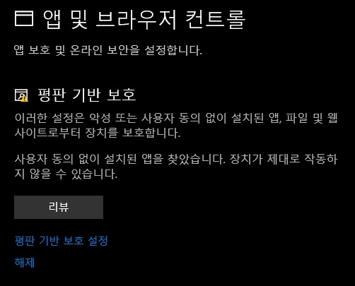 이 문제의 해결을 위해서는 윈도우 '설정 > 업데이트 및 보안 > Windows 보안 > 윈도우즈 보안 열기 버튼 클릭 > 앱 및 브라우저 컨트롤 > 평판 기반 보호 설정' 항목으로 이동해서 해결해야 합니다.