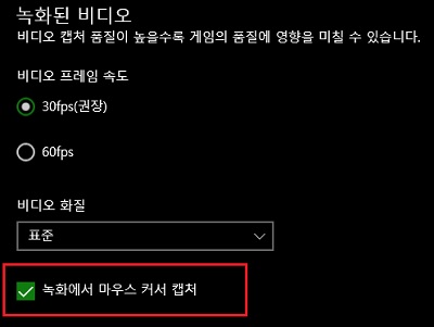 윈도우 게임바로 녹화시 마우스 커서 노출 옵션