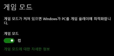 만약 Xbox나 콘솔 게임 등을 전혀 하지 않는 분이라면 구지 게임 모드를 켜 둘 필요는 없습니다. 게임 모드 기본값이 On으로 설정되어 있으므로 필요 없는 경우 꺼두실 수 있습니다.