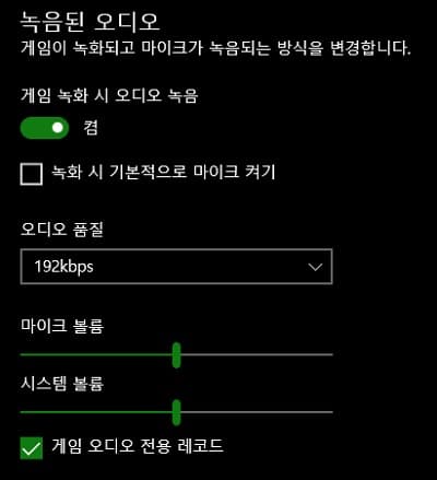 게임 녹화 시 오디오 녹음을 On/Off 설정할 수 있고 녹화 시 기본적으로 마이크 켜기에 체크해 두면 게임 녹화 시 자동으로 마이크가 켜지게 됩니다.