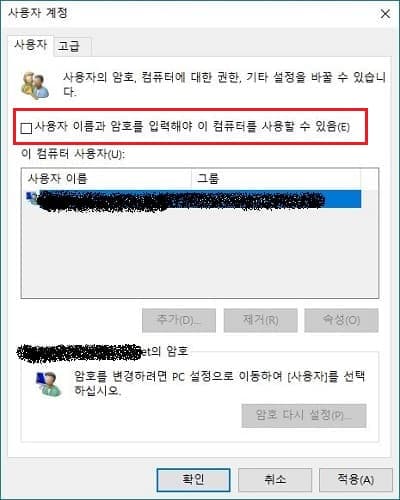 - netplwiz를 실행하여 '사용자 이름과 암호를 입력해야 이 컴퓨터를 사용할 수 있음'의 체크를 해제합니다.