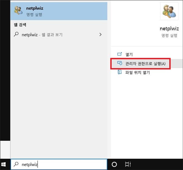 윈도우 작업 표시줄의 검색창에 netplwiz라고 입력한 후 관리자 모드로 실행합니다.