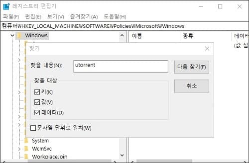 편집 메뉴에서 찾기를 클릭하고 uTorrent라고 타이핑한 다음 레지스트리의 편집기에서 해당하는 단어가 나오는 모든 항목을 삭제합니다.
