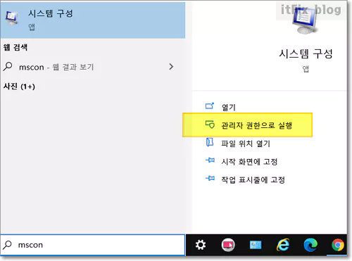 위에서 설명한 삭제거부를 회피하기 위해 안전모드에서의 제거를 시도해 볼 수도 있습니다. 윈도우 작업 표시줄의 검색상자에 msconfig라고 입력한 다음 관리자 권한의 시스템 구성을 실행합니다.