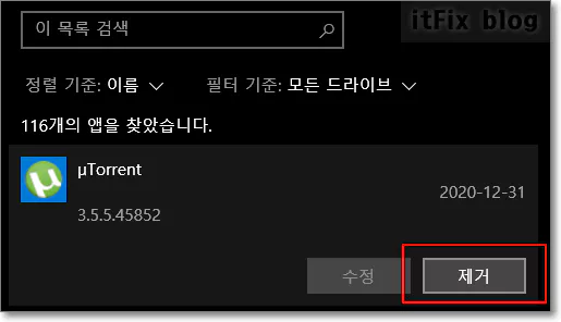 앱 및 기능 페이지에서 유토렌트 아이콘을 클릭하면 제거 버튼이 보입니다. 제거 버튼을 눌러 앱을 제거합니다.