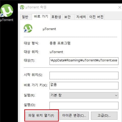uTorrent의 바탕화면 아이콘 등의 실행 아이콘을 우클릭한 다음 속성을 클릭합니다. 아래와 같은 uTorrent 속성 창이 뜹니다. 다음으로 '파일 위치 열기'를 클릭합니다.