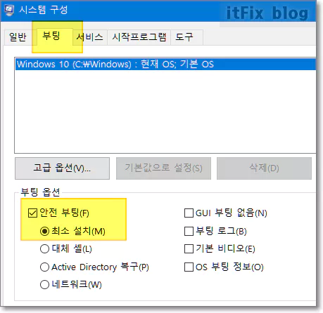 관리자 권한의 시스템 구성이 실행되면 부팅탭을 클릭한 다음 최소 옵션으로 안전 부팅에 체크한 다음 적용 및 확인을 눌러 안전모드로 재시작합니다.