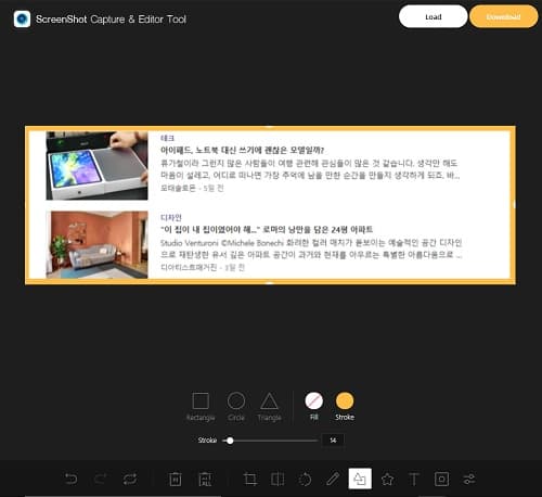 - 스크롤 캡처 화면의 하단에 이미지 편집 도구가 있어 웹에서 바로 편집 후 저장도 가능합니다. 편집 도구에서 사각형, 원, 화살표, 선 등을 추가하고 자르기, 회전, 뒤집기, 텍스트 삽입, 각종 필터 등등의 작업을 가능하게 해 줍니다.