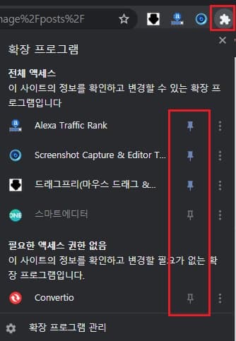 따라서 자주 사용하는 확장 프로그램은 핀 모양을 클릭하여 우측 상단에 보이게 설정할 수 있습니다. 이미 이 기능을 알고 계신 분들은 별 의미 없는 글이겠지만 저같이 브라우저 기능 적응이 느린 분 들은 알고 나면 매우 편리하게 사용할 수 있는 기능이라고 생각되어 별도로 포스팅까지 하게 되었습니다.