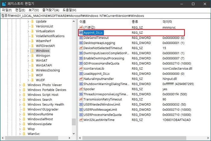 우측의 항목에서 AppInit_DLLs의 값이 있다면 더블 클릭한 다음 값을 제거해서 아래의 이미지에서처럼 공란이 되게 만드시기 바랍니다. 이후 윈도우즈를 재시작합니다.