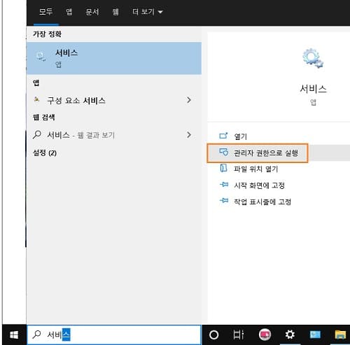 작업표시줄의 검색창에 '서비스'라고 입력한 다음 관리자 권한으로 실행합니다.
