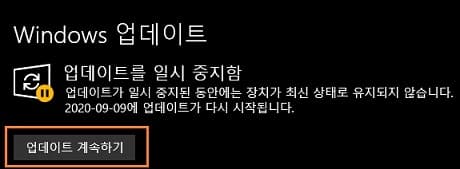 위의 항목에서 특정 날짜까지 업데이트가 일시 중지 중이라면 자동 업데이트 아이콘에 노란색 일시 정지 표시가 생기게 됩니다. '업데이트 계속하기'를 눌러 자동 업데이트를 활성화시켜 주시기 바랍니다.