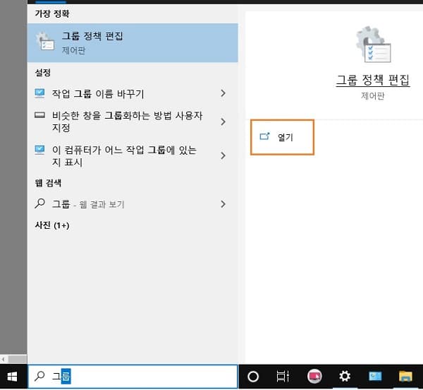 윈도우즈 작업표시줄의 검색창에 그룹 정책 편집기라고 타이핑하여 정책 편집기를 실행합니다.