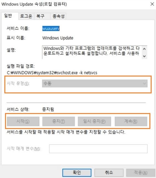 다시 한번 윈도우즈 업데이트 서비스의 시작 유형 설정이 아직도 비활성화인지 확인해 보시기 바랍니다.