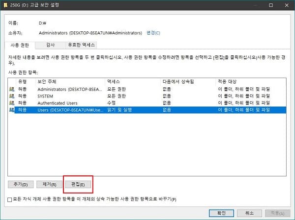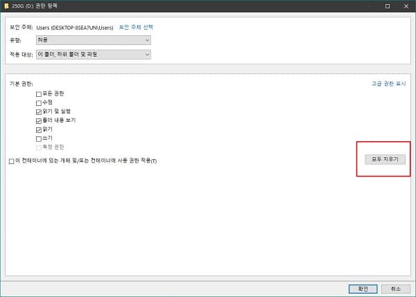 편집을 누르면 팝업 되는 권한 항목 창에서 우측의 모두 지우기를 클릭한 다음 확인을 클릭합니다.
