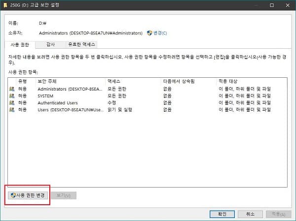 하단의 고급 버튼을 누른 다음 다음으로 나타나는 창에서 하단의 사용 권한 변경 버튼을 누릅니다.