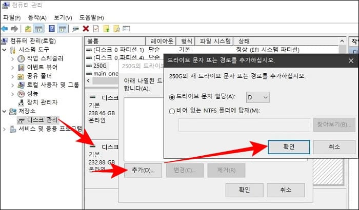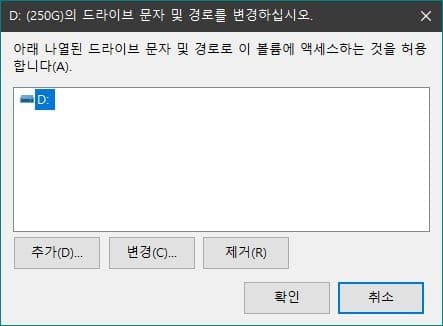 다시 드라이브를 원래대로 되돌리려면 내 PC를 우클릭해 관리 > 디스크 관리에서 해당 드라이브를 우클릭한 다음 드라이브 문자 및 경로 변경을 클릭합니다. 추가를 눌러 이전 드라이브와 동일한 문자를 할당해주면 끝이 납니다.