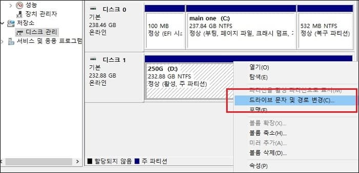 이 작업은 하나의 물리 디스크가 두 개의 파티션 드라이브로 나누어져 있는 경우 하나의 파티션 드라이브에만 적용하는 것도 가능하다는 점에서 무조건 디스크 0번, 디스크 1번처럼 실제 디스크 단위로만 변경되는 물리 디스크에서 연결선을 뽑는 것과는 적용 범위가 다릅니다.