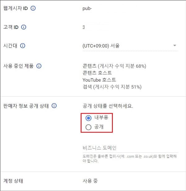 다음에 뜨는 페이지에서 '판매자 정보 공개 상태' 항목을 내부용에서 공개로 바꾸어 줍니다. 그리고 바로 아래의 비지니스 도메인란에는 tistory.com이라고 타이핑해 줍니다. 저장은 실시간 자동으로 됩니다.