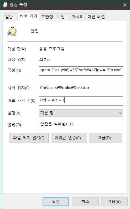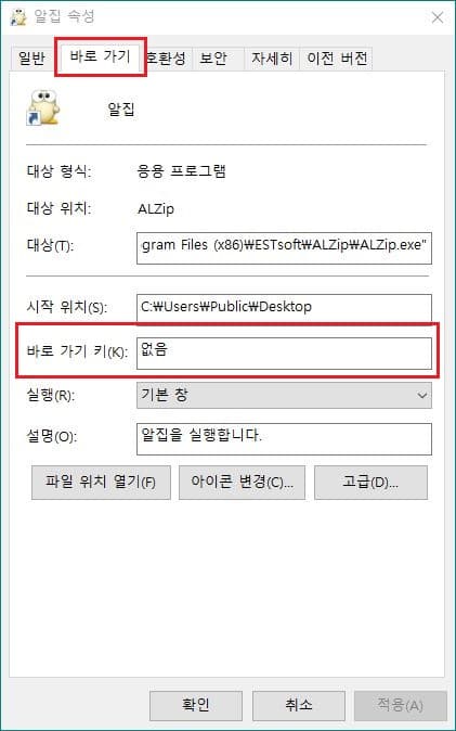 - 알집의 바로가기를 우클릭하여 속성창을 열고 바로 가기 탭에서 바로 가기 키의 기본값인 없음을 변경해 주면 됩니다.