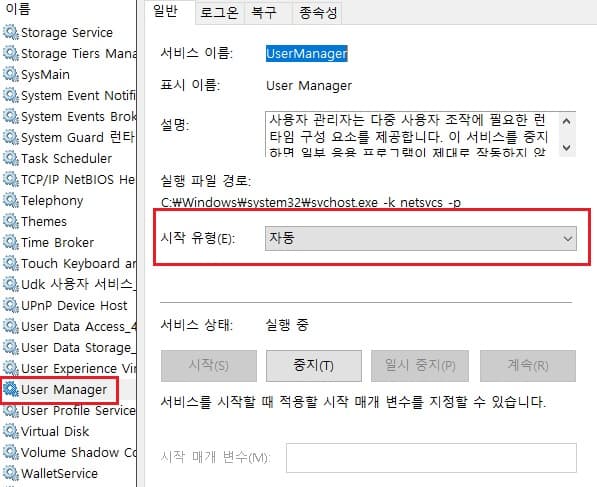 서비스 실행창에서 user manager라는 항목을 찾습니다.