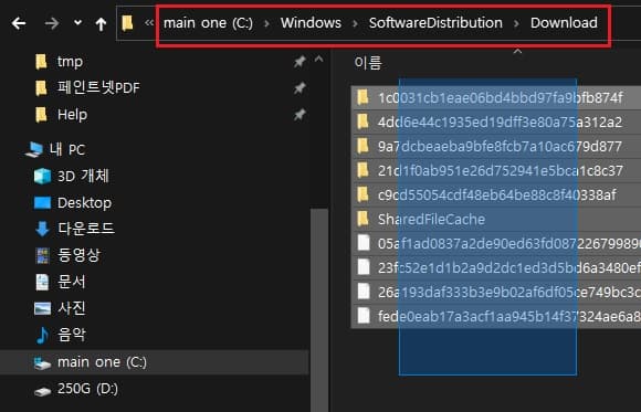 파일 탐색기에서 아래의 경로로 열고 download 폴더 안에 있는 모든 파일을 마우스 드래그로 모두 선택하여 삭제합니다.