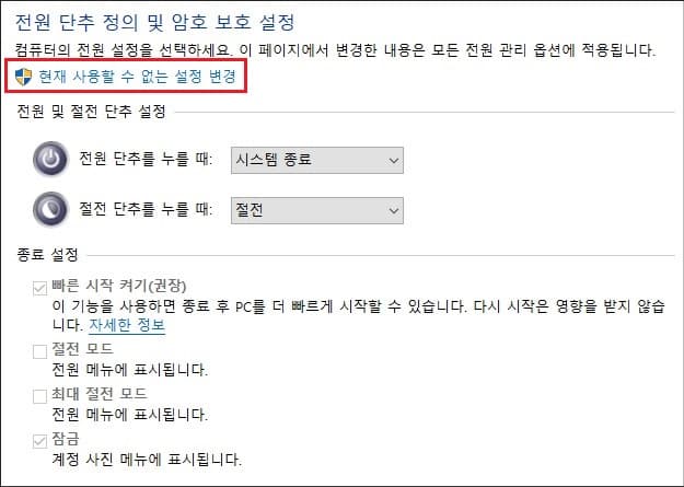 아래쪽에 있는 종료 설정을 변경할 수 없게 되어 있는 경우에는 위쪽에 있는 '현재 사용할 수 없는 설정 변경'을 클릭합니다.