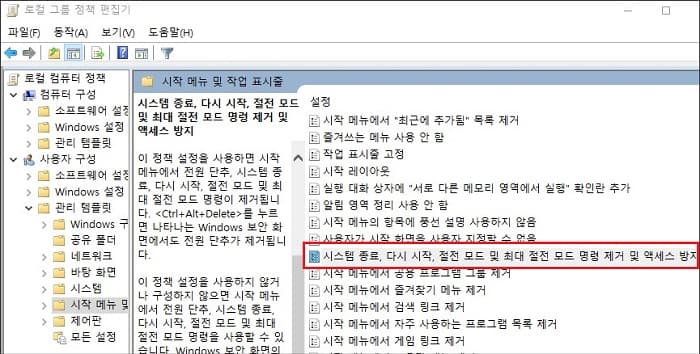 사용자 구성 - 관리 템플릿 - 시작 메뉴 및 작업 표시줄 - 시스템 종료, 다시 시작, 절전 모드 및 최대 절전 모드 명령 제거 및 액세스 방지