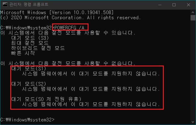 제 메인 보드는 S0, S1, S2를 지원하지 않는 다고 나오네요. 하지만 대기 모드와 최대 및 하이브리드 절전 모드가 지원되므로 큰 문제는 없습니다.