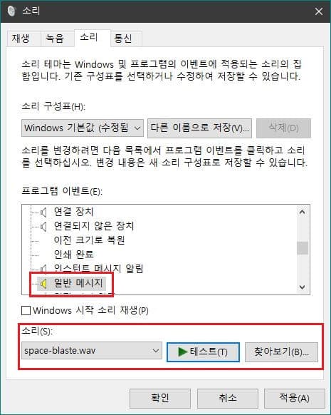 나중에 복잡하게 변경해서 정확한 기본 효과음으로 되돌아가기 힘들 경우에는 위쪽의 소리 구성표에서 언제든지 'Windows 기본값'을 선택해 주면 기본 효과음들로 다시 세팅됩니다. 아래의 3번 항목처럼 아예 특정 효과음을 윈도우 기본음이 아닌 다른 음으로 바꾼 경우에도 역시 윈도우즈 기본값으로 복원할 수 있습니다.