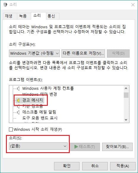 예를 들어 윈도우의 경고음이 듣기 싫다고 가정하면 소리 탭의 하단 효과음중 경고 메시지를 선택한 다음 그 아래쪽의 소리(S) 항목의 드롭다운 메뉴를 클릭한 위쪽에 있는 '없음'을 선택합니다.