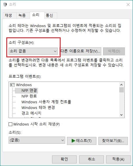 소리 설정 창에서 소리 탭을 선택한 다음 '소리 구성표'의 기본값인 Windows 기본값을 소리 없음으로 변경한 다음 하단의 적용 및 확인 버튼을 눌러 줍니다.