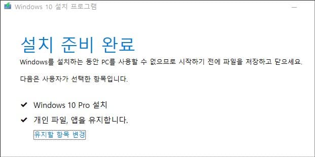 설치 준비 단계 완료 후 마지막으로 우측 하단의 설치를 클릭하면 윈도우즈 설정이나 개인 파일을 유지할지 묻는 창이 나오는데 유지를 선택한 다음 다음 버튼을 누릅니다. 기본값이 개인 파일 및 설정 유지이므로 다음 버튼만 누르시면 됩니다.