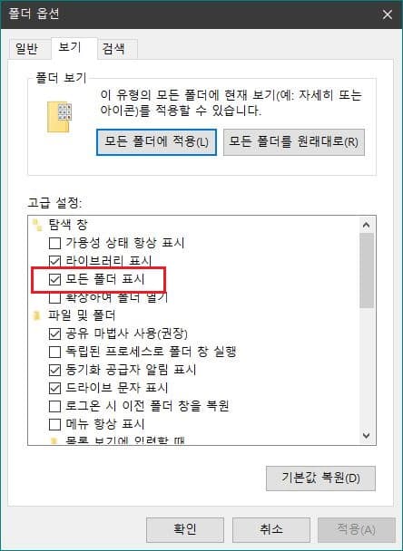 파일 탐색기 상단의 보기 메뉴에서 폴더 옵션으로 들어갑니다. 그다음 보기 탭에서 모든 폴더 표시에 체크 표시만 해주고 적용하면 끝입니다.