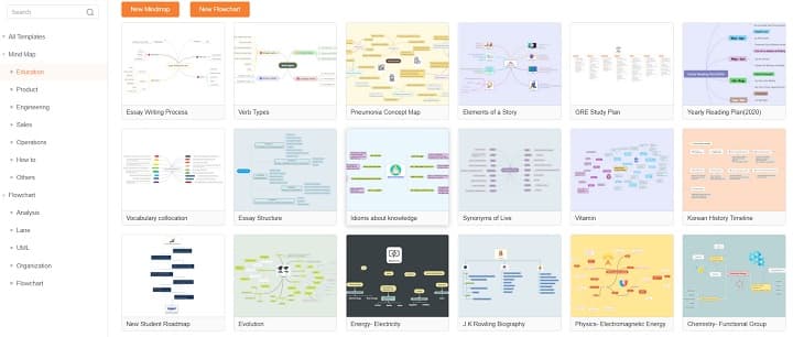 템플릿 갤러리와 테마, 준비된 각종 형식의 마인드 맵, 차트, 조직도, 순서도, 다이어 그램 등을 무료로 제공하고 있어 쉽게 원하는 구상대로 제작이 가능합니다.
