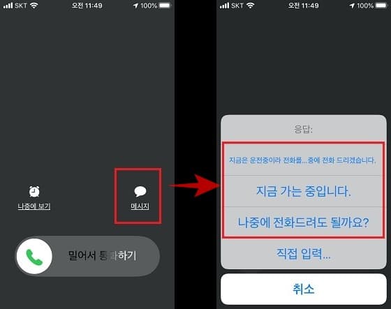 텍스트 문구를 3개만 작성할 수 있다는 제한이 있지만 운전중이거나 기타 중요한 작업을 하는 중 이라거나 하는 등의 전화를 받을 수 없는 환경인 경우에 유용하게 사용할 수 있습니다.