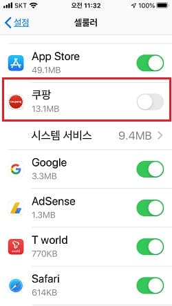 아래의 경로로 이동한 다음 아래쪽으로 내리면 설치된 각 앱 마다 사용한 데이터 량이 나오게 됩니다. 여기에서 우측의 스위치를 OFF 하면 해당 앱은 셀룰러 데이터를 사용할 수 없게 됩니다. 물론, 와이파이의 사용은 상관없습니다.
