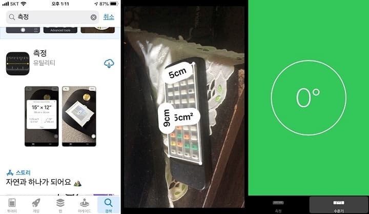 측정 항목과 수준기 항목으로 나뉘어 있으며 측정 항목은 측정할 대상을 터치하면 가로와 세로 길이 등이 측정되며, 수준기에서는 수평과 수직을 측정합니다. 정확한 수평은 초록색 바탕에 0으로 표시됩니다.