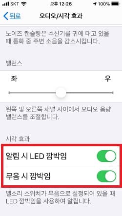 - 설정 > 손쉬운 사용 > 오디오/시각 효과 > 알림 시 LED 깜빡임