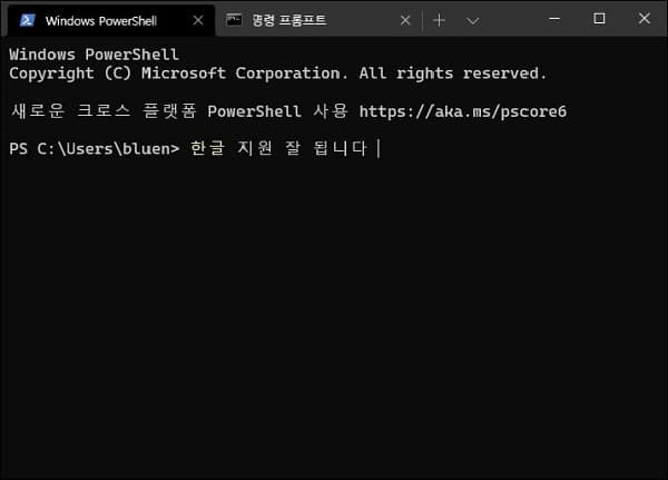 기존의 한글 적용에 문제가 있었던 부분은 모두 수정되어 파워셀 창과 명령 프롬프트 창 모두에서 안정적으로 한글을 표시해 주고 있습니다.