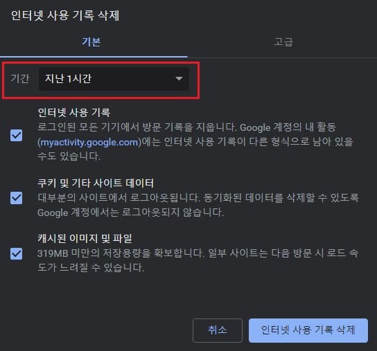5. 삭제창에서 삭제할 사용 기록의 기간을 선택하거나 고급 탭을 클릭하고 좀 더 세밀하게 제거 옵션을 지정할 수 있습니다.