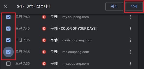3. 삭제하고자 하는 방문 기록에 체크 표시한 다음 위쪽에 나타난 삭제 버튼을 누릅니다. 이렇게 선별적으로만 삭제할 경우에는 외관상 자연스럽게 보여 삭제했는지에 대한 판단이 어려울 정도의 자연스러운 방문 기록 형태를 유지하게 됩니다. 다만, 제거할 기록이 많은 경우에는 다소 귀찮을 수 있습니다.