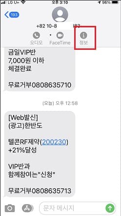아래의 이미지는 주식투자 권유 스팸 메시지입니다. 상단의 정보 아이콘을 터치합니다.