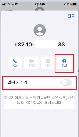 2. 추가된 알림 가리기 옵션과 정보 아이콘 다시 한번 터치