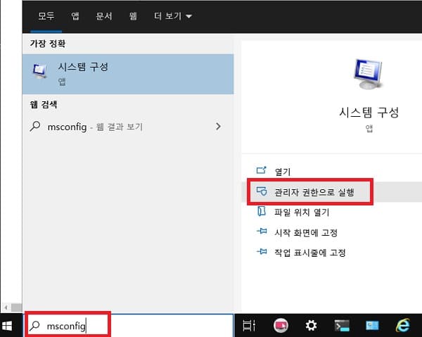 - 작업표시줄의 검색창에 msconfig를 입력한 뒤 관리자 권한으로 실행에 엔터