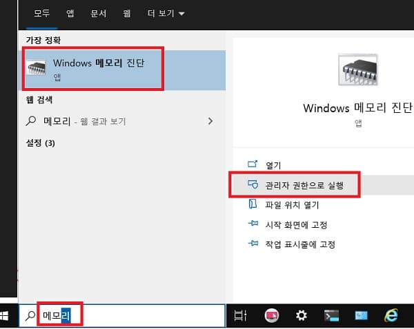 윈도우즈 작업 표시줄의 검색창에 메모리 진단이라고 입력한 후 관리자 권한으로 메모리 진단을 실행합니다.