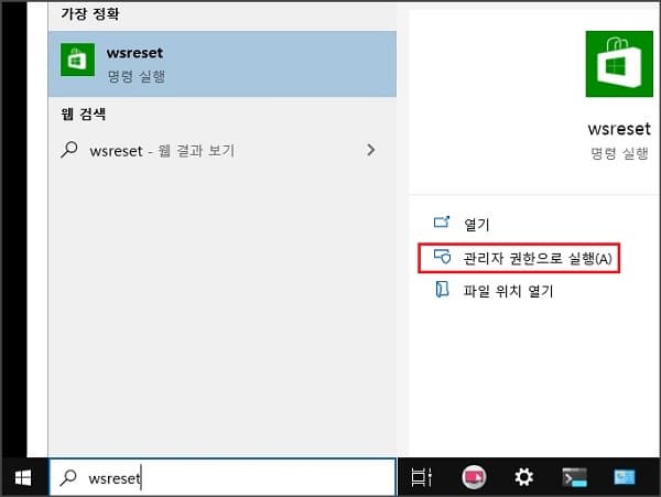 - 작업표시줄의 검색란에 wsreset라고 타이핑한 다음 관리자 권한으로 실행합니다.