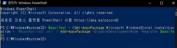 아래의 명령어를 마우스로 드래그하여 복사한 다음 관리자 권한의 파워셀 창에 붙여 넣기 합니다.