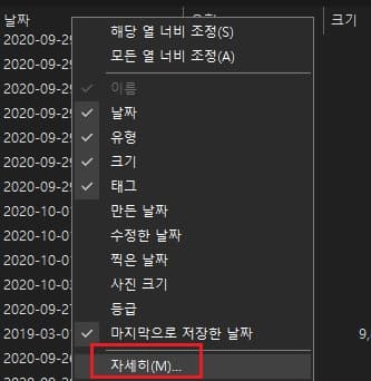 자세히 보기 설정 상태에서 우측 파일창 상단의 분류 메뉴바를 우클릭한 다음 자세히를 클릭합니다. 자세히를 클릭하여 수많은 분류 항목 중 원하는 메뉴를 추가하여 사용자 설정한 다음 탐색기를 사용할 수도 있습니다.